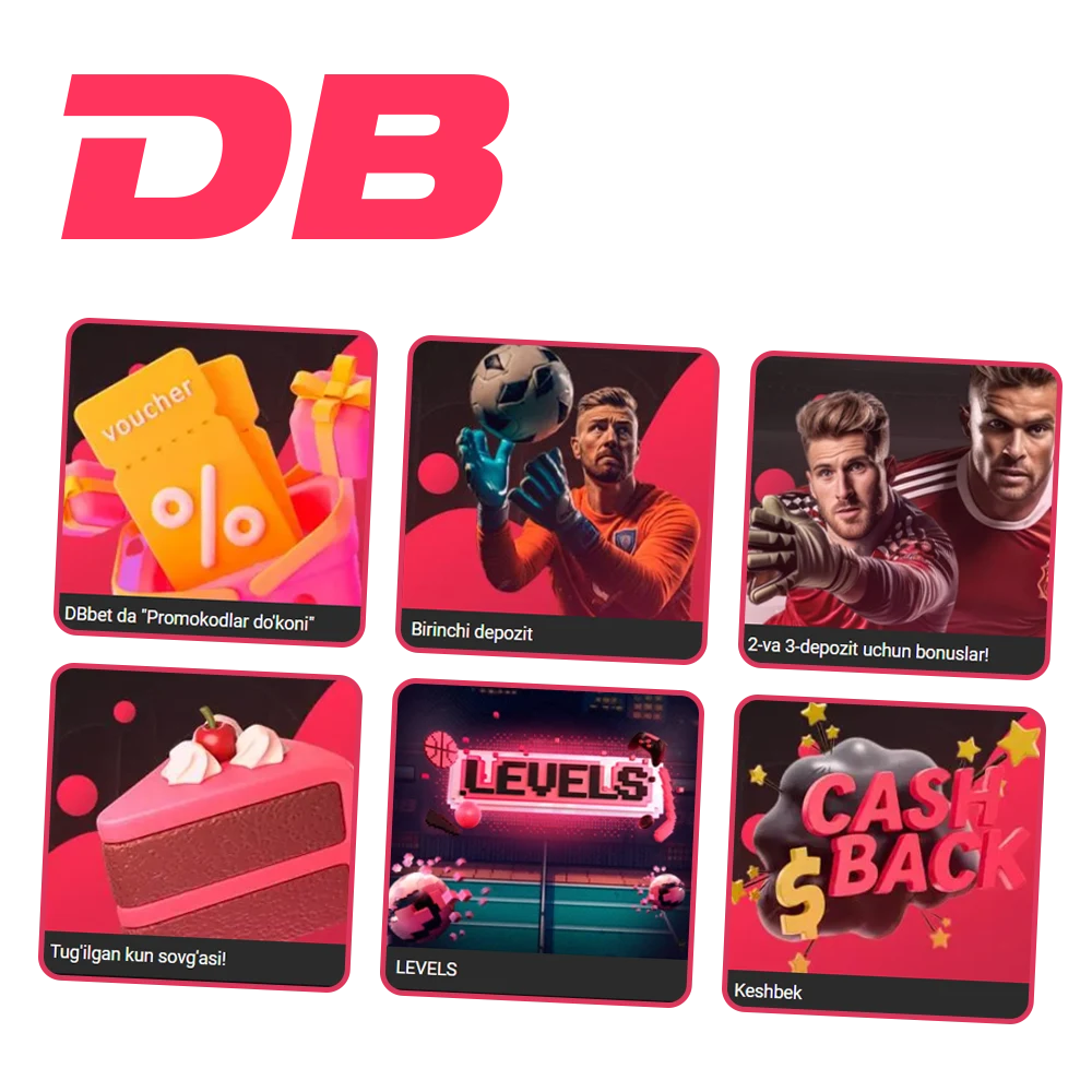 Ushbu sahifada siz barcha mavjud DBbet bonuslari va ularni qanday olish bo’yicha ko’rsatmalar haqida batafsil ma’lumot topasiz.