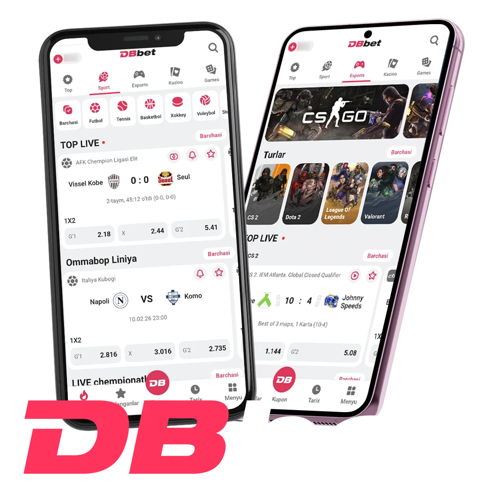 DBbet har bir O’zbekiston foydalanuvchisi uchun mavjud bo’lgan Android va iOS smartfonlari uchun qulay bepul mobil ilova yaratdi. Uning yordamida siz istalgan vaqtda, istalgan joyda balansingizni boshqarishingiz, pul tikishingiz va kazino o’yinlarini o’ynashingiz mumkin. DBBet ilovasi sportning keng tanlovini, bepul jonli translyatsiyalarni, minglab kazino o’yinlarini, foydalanuvchilar uchun qulay interfeysni va har doim qo’lingizda bo’ladigan to’liq vositalar to’plamini taklif etadi.